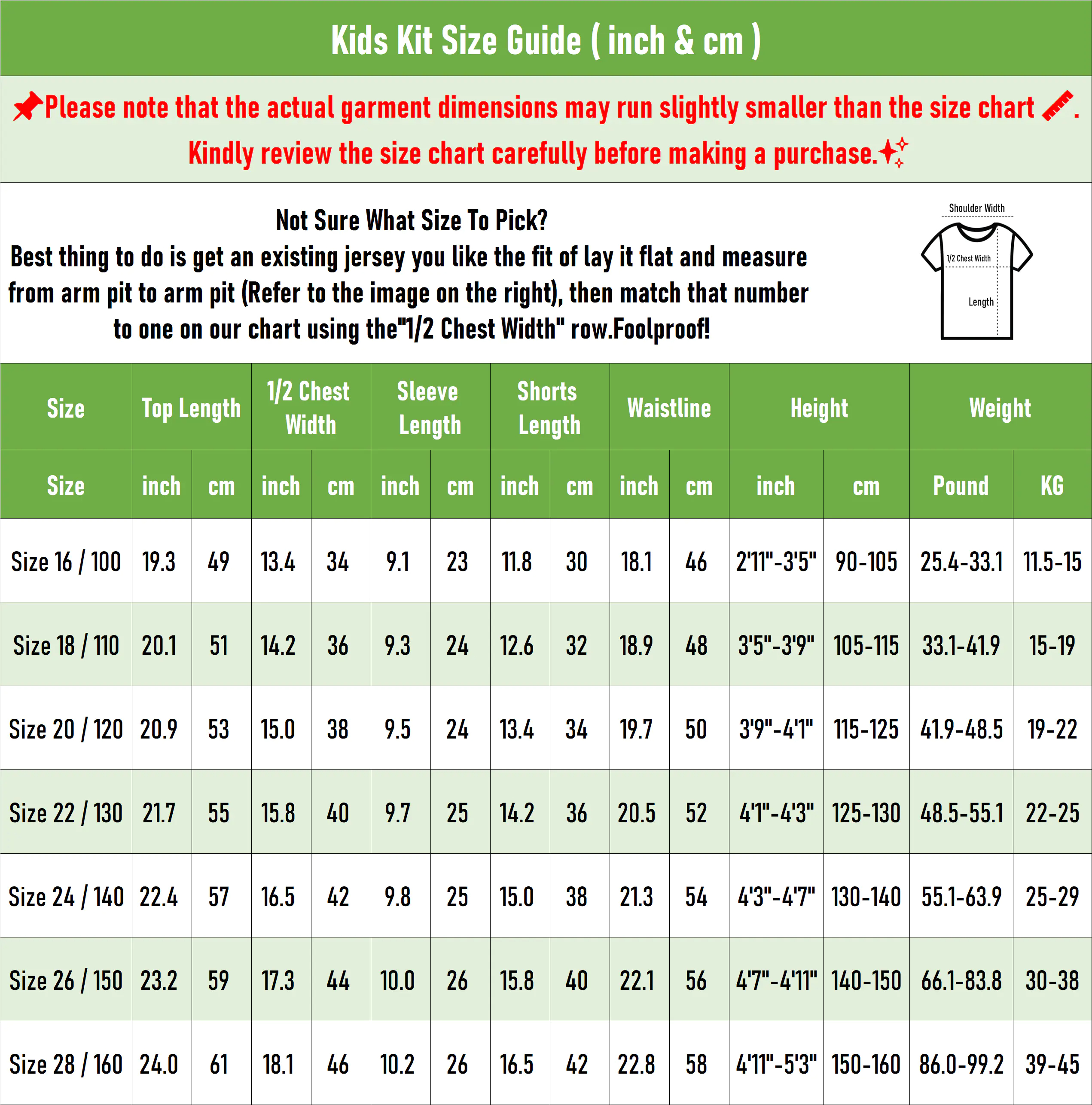 ◾Kids Kit Size Guide